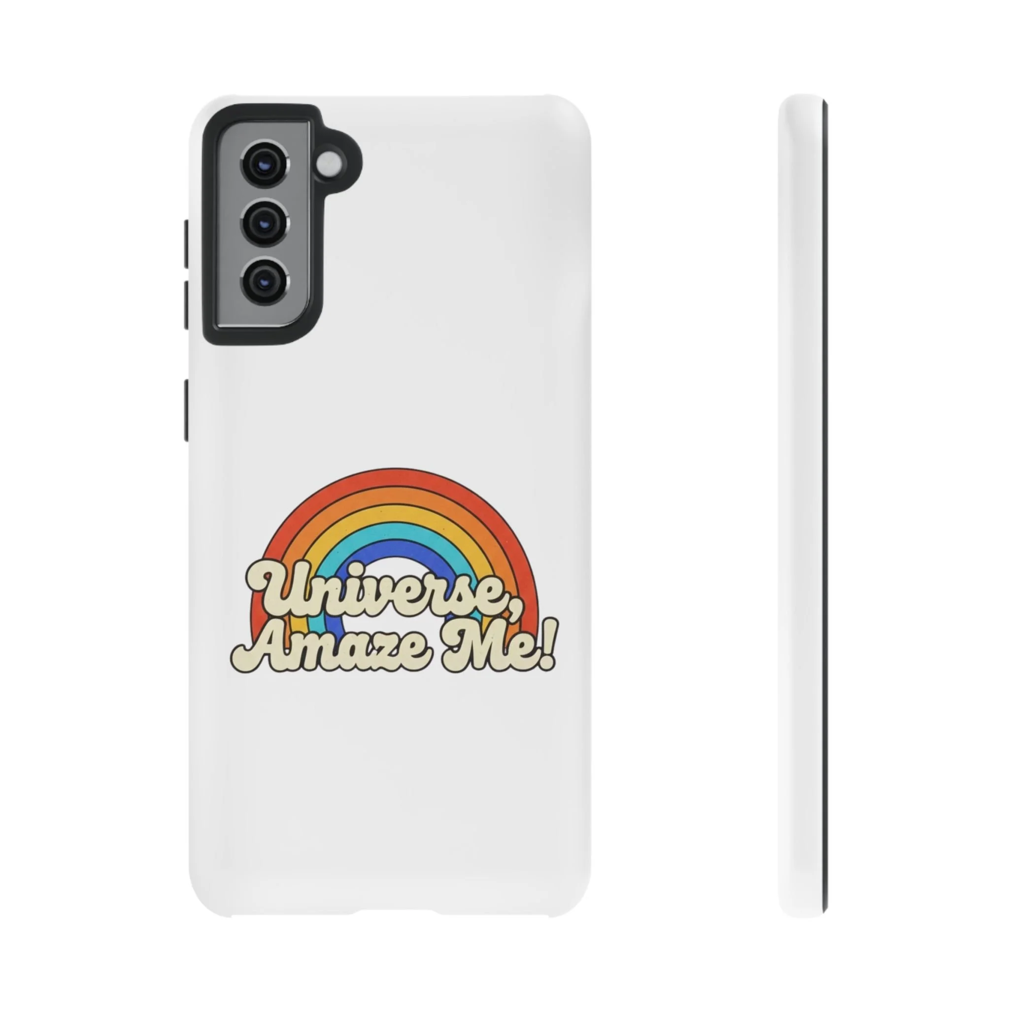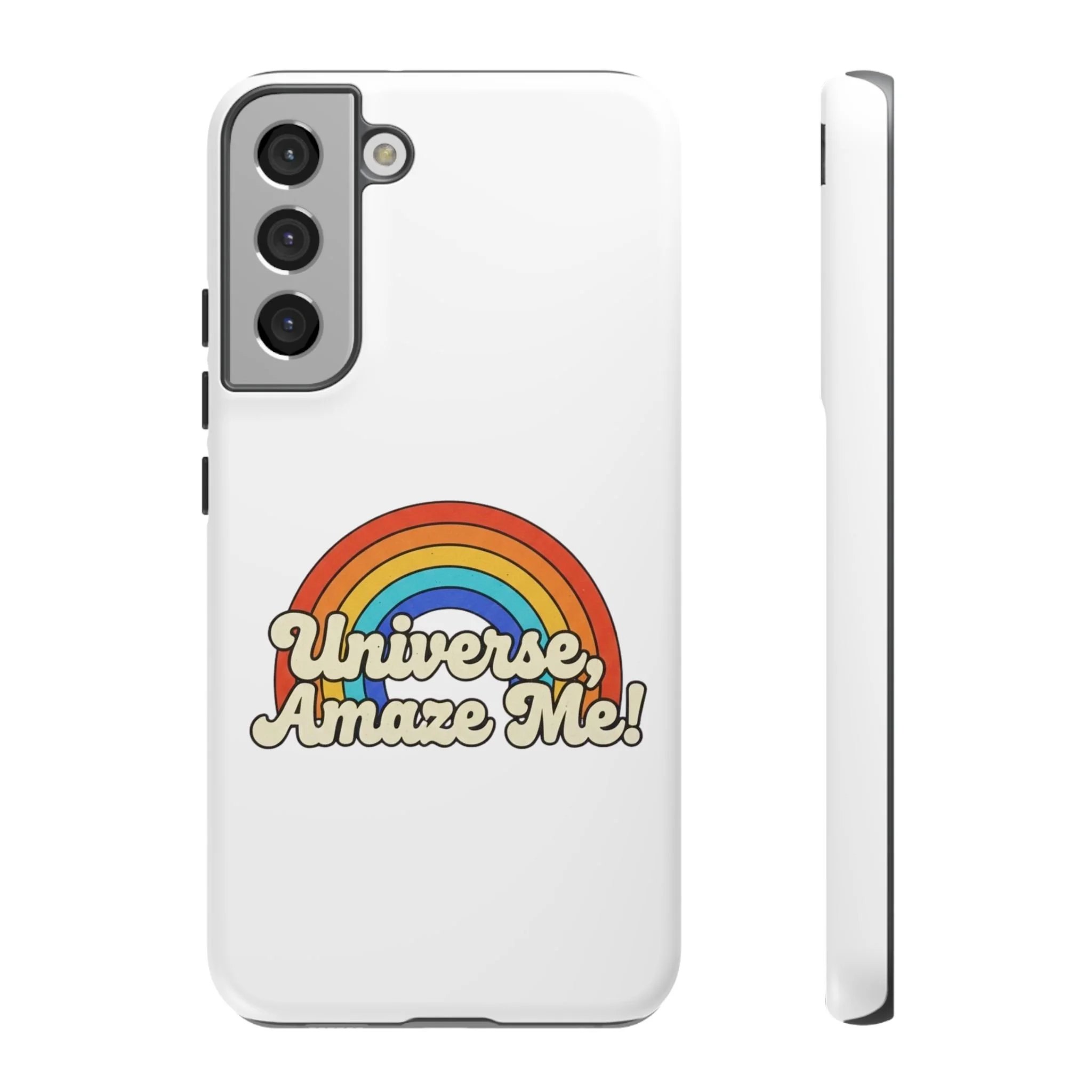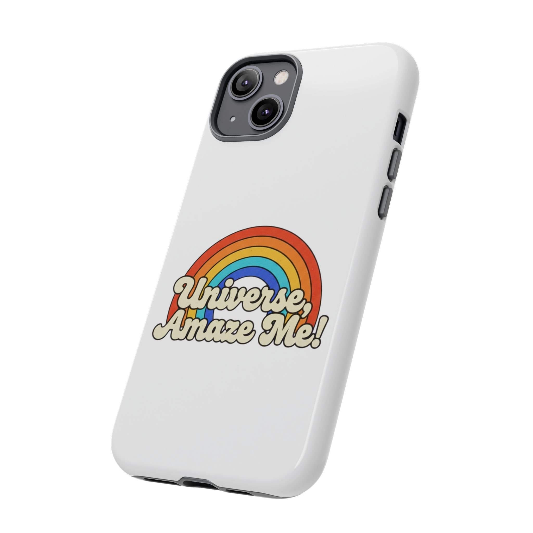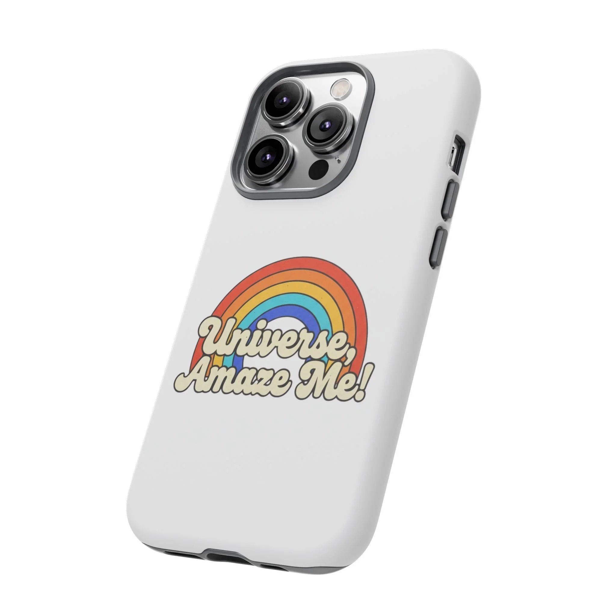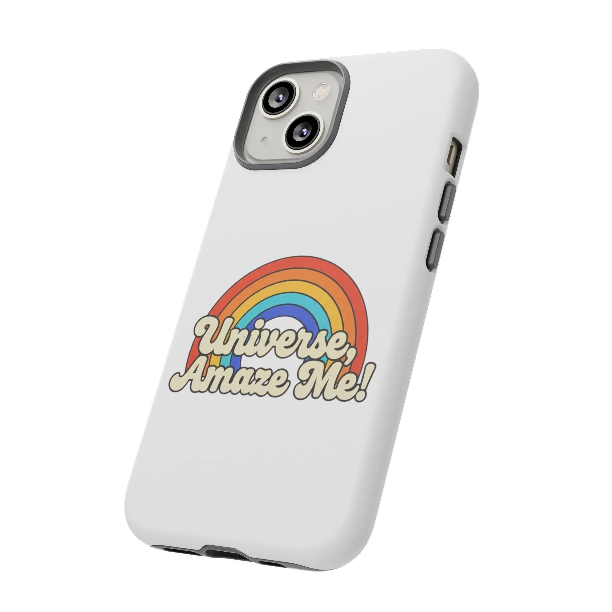 A slim, dual-layer protective phone case with a cheerful retro rainbow and the playful phrase “Universe, Amaze Me!” Centered on a clean white background, the vintage-inspired script and warm tones bring a sunny, optimistic energy to your everyday carry. The glossy or matte outer shell features full 3D wrap printing for vibrant, edge-to-edge artwork, while the TPU silicone liner cushions impacts and keeps your phone safe from drops. Weather-resistant inks and certified materials mean the design keeps its color outdoors, and precise port cutouts preserve full connectivity and wireless charging support. This case fits into a joyful, curiosity-driven lifestyle — a small reminder to look up, stay hopeful, and carry a little color with you wherever you go.