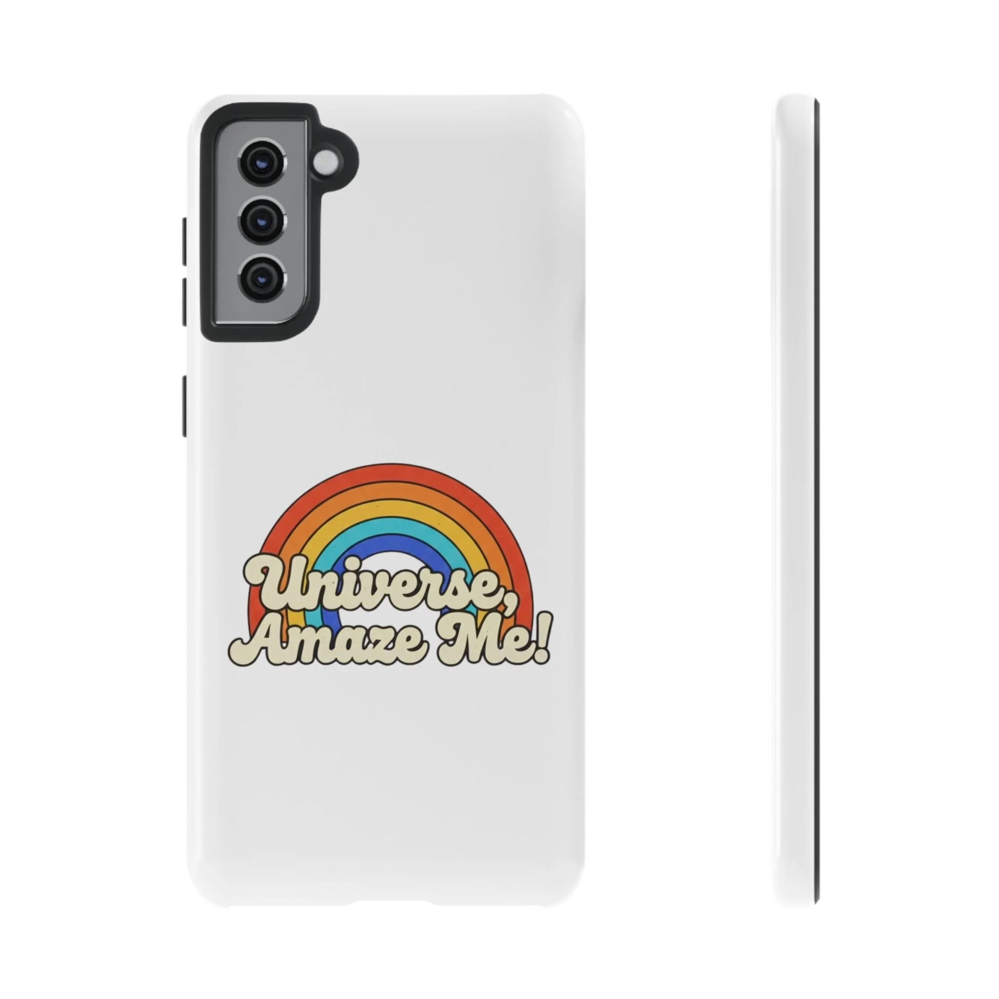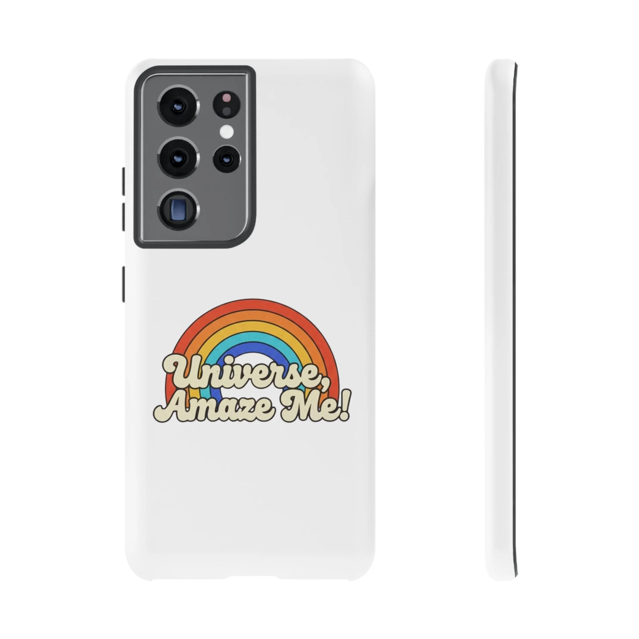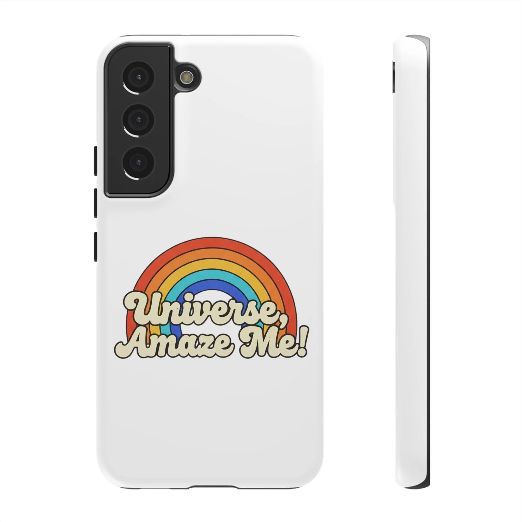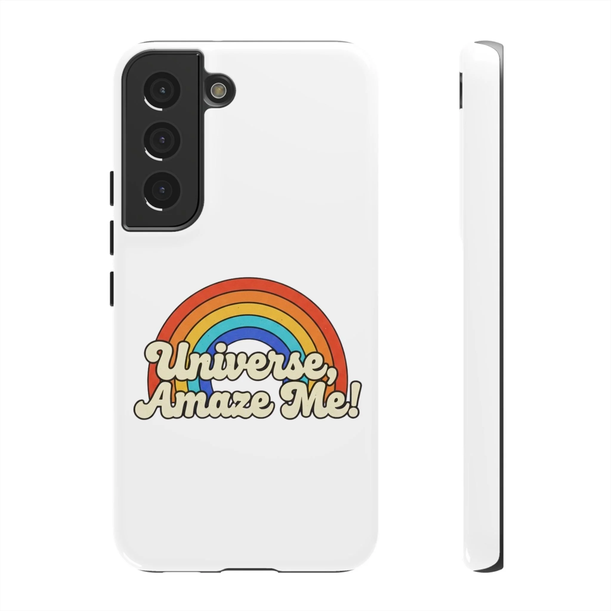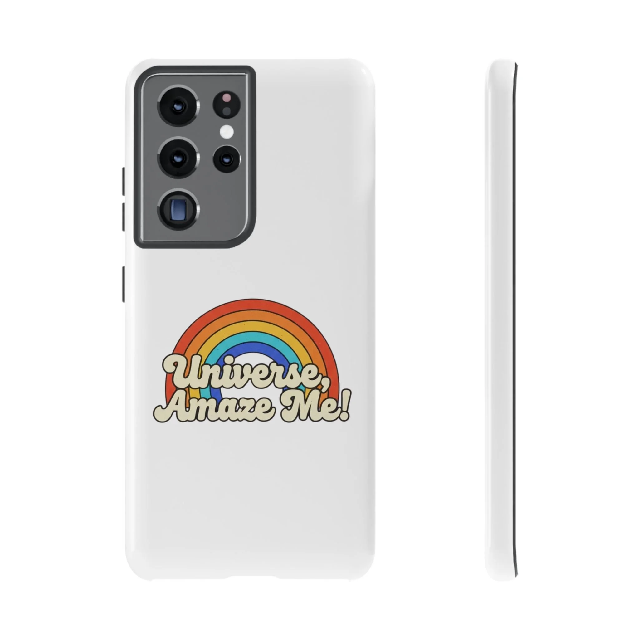 A slim, dual-layer protective phone case with a cheerful retro rainbow and the playful phrase “Universe, Amaze Me!” Centered on a clean white background, the vintage-inspired script and warm tones bring a sunny, optimistic energy to your everyday carry. The glossy or matte outer shell features full 3D wrap printing for vibrant, edge-to-edge artwork, while the TPU silicone liner cushions impacts and keeps your phone safe from drops. Weather-resistant inks and certified materials mean the design keeps its color outdoors, and precise port cutouts preserve full connectivity and wireless charging support. This case fits into a joyful, curiosity-driven lifestyle — a small reminder to look up, stay hopeful, and carry a little color with you wherever you go.