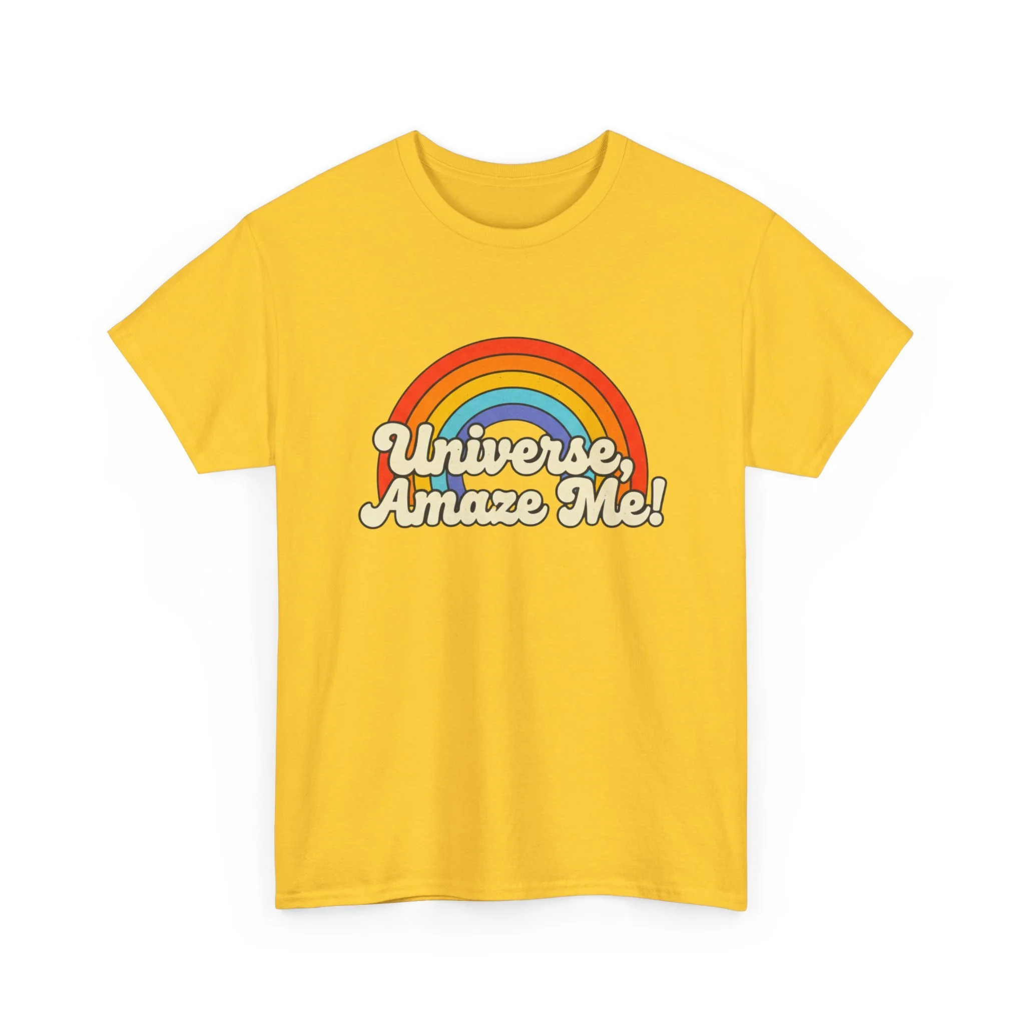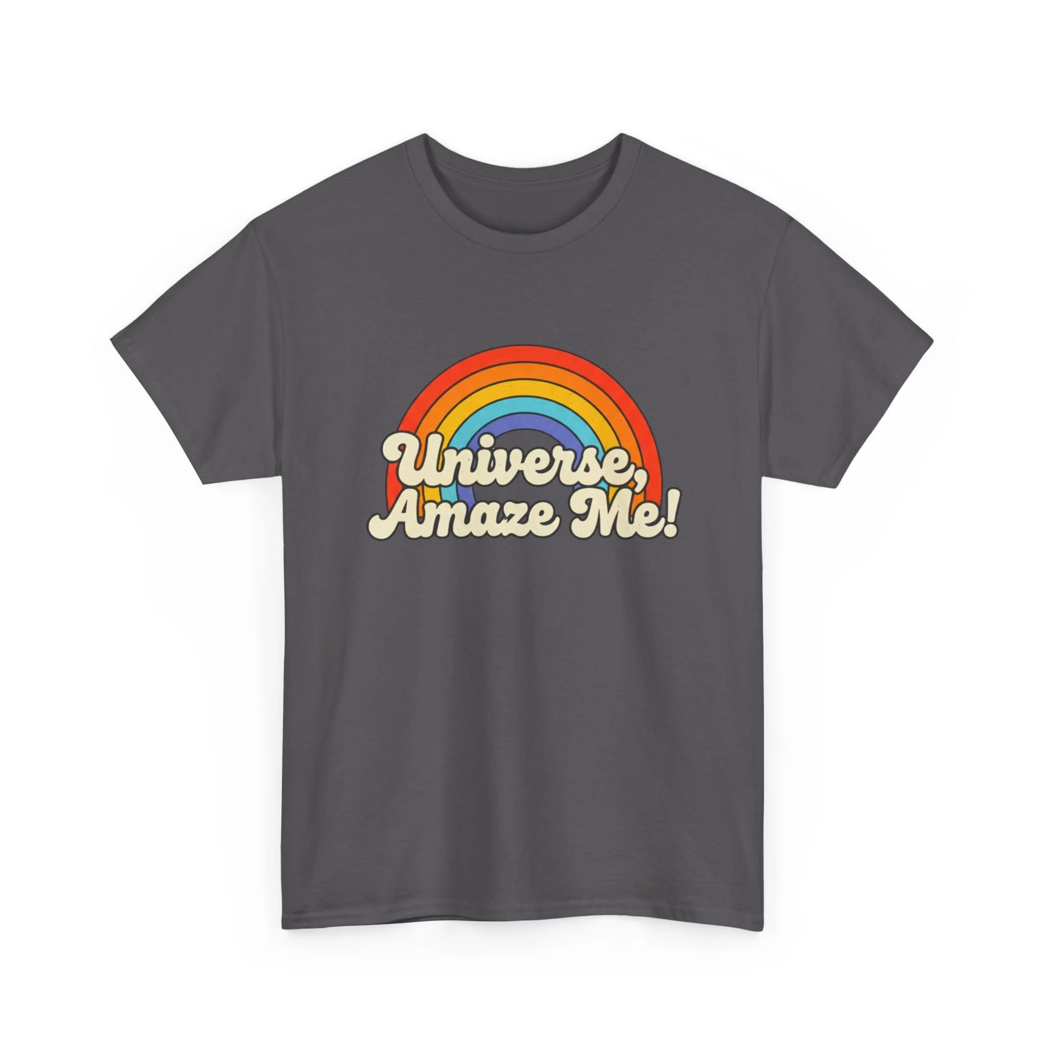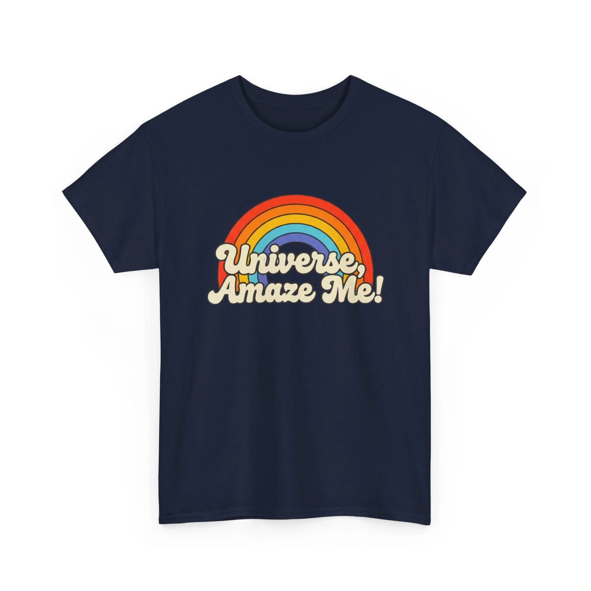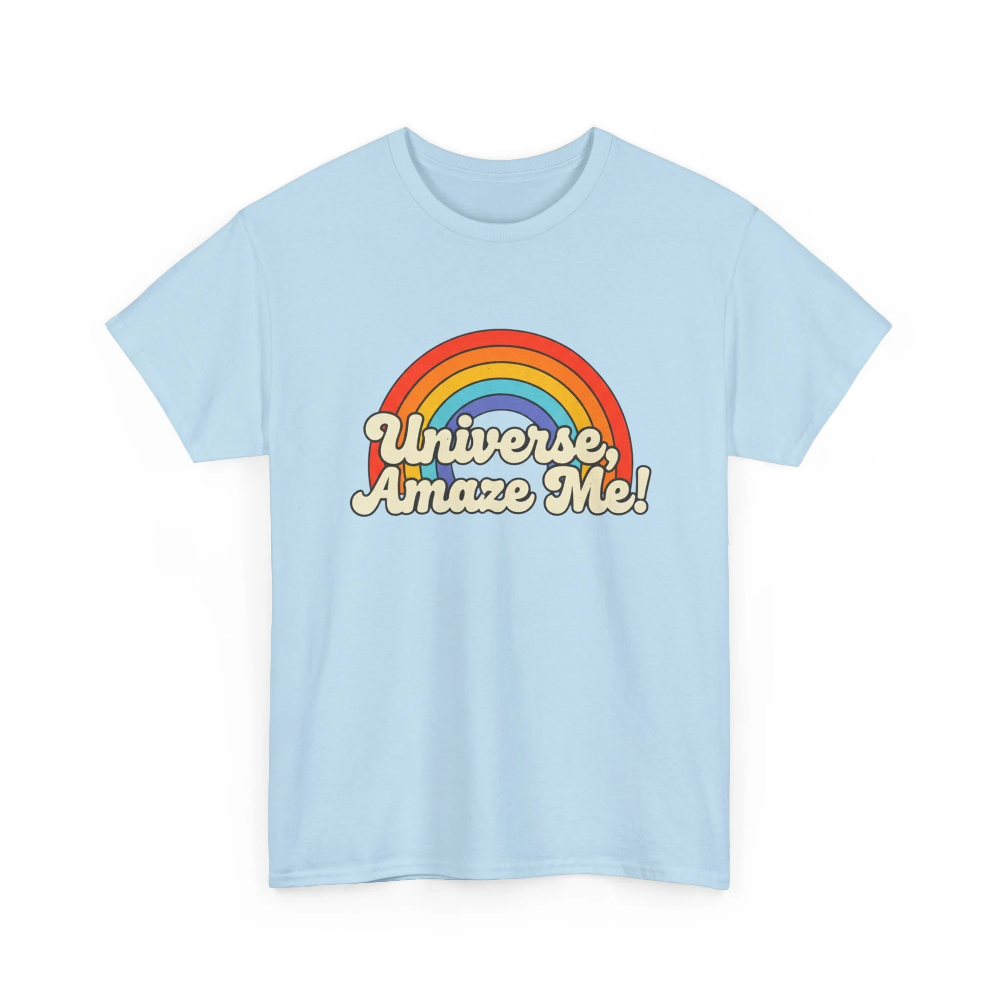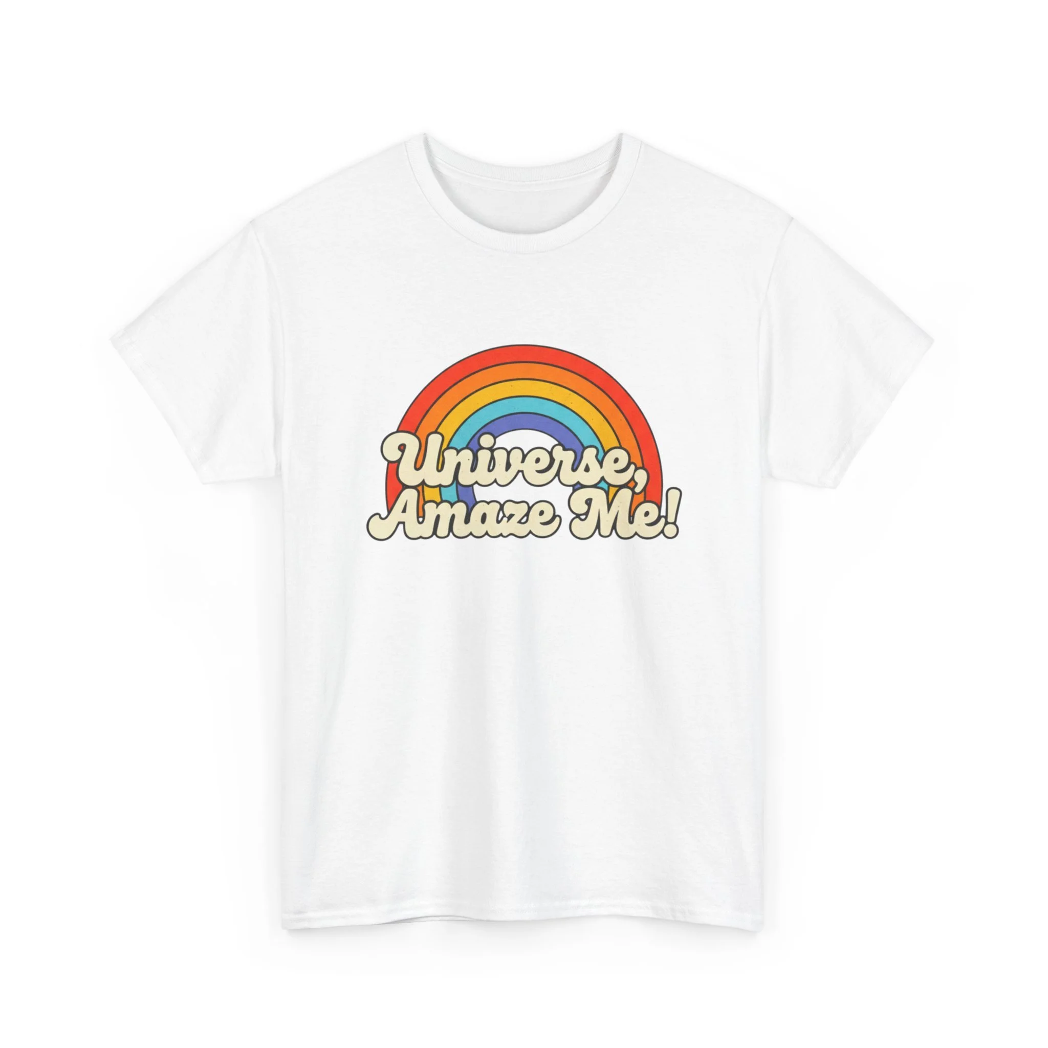 The Universe, Amaze Me tee sends your mantra out to the universe! Soft, nostalgic, and quietly bold — this classic tee carries a warm rainbow and the playful line “Universe, Amaze Me!” across the chest. Wear it when you want a little optimism tucked into your day: morning coffee runs, slow drives with the windows down, or low-key hangouts with friends who get your vintage-loving, wonder-chasing vibe. The design sits centered and approachable, the colors feeling sun-faded rather than shouty — like a retro postcard for hopeful days. It layers easily under a denim jacket or stands alone with rolled sleeves, adding personality without trying too hard. Lightweight but sturdy, it moves with you and keeps its shape through repeat wears and washes.