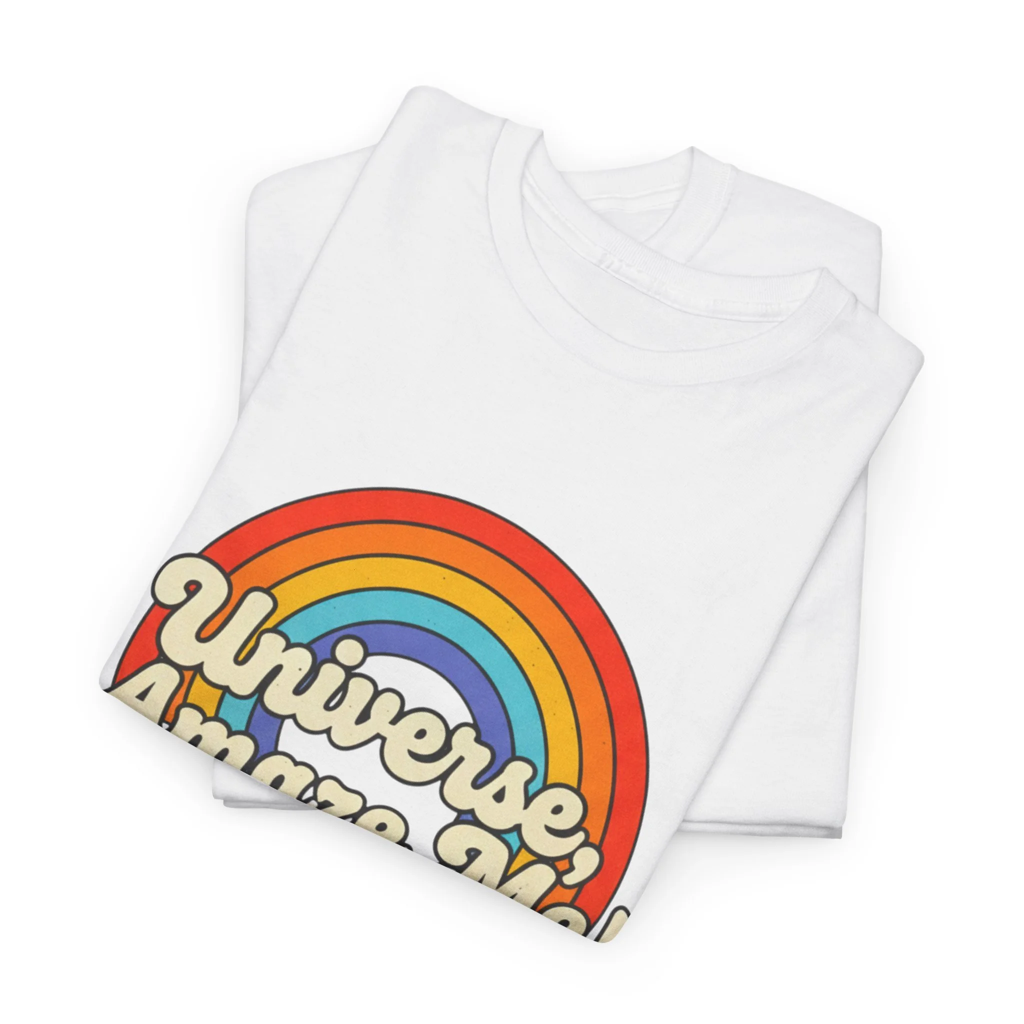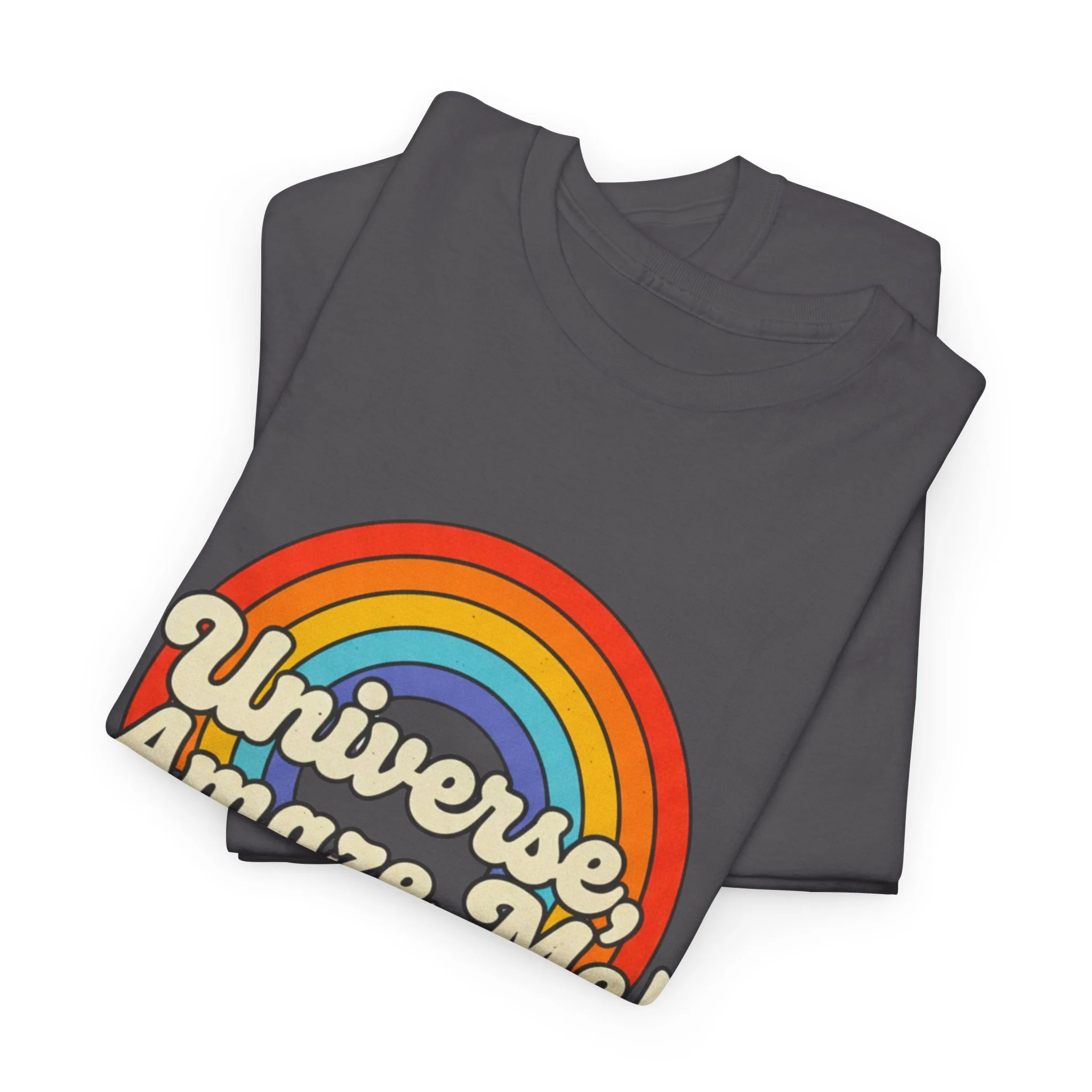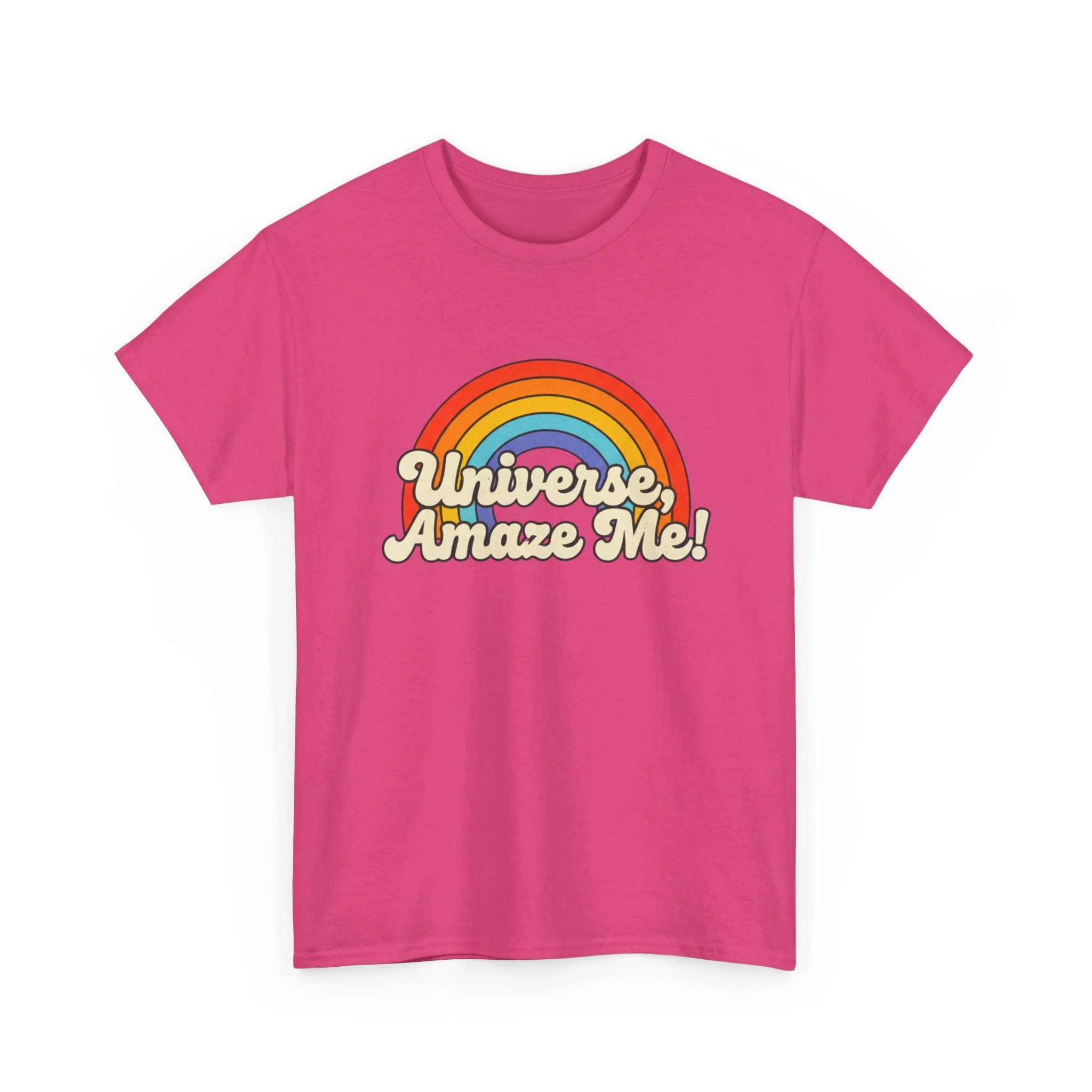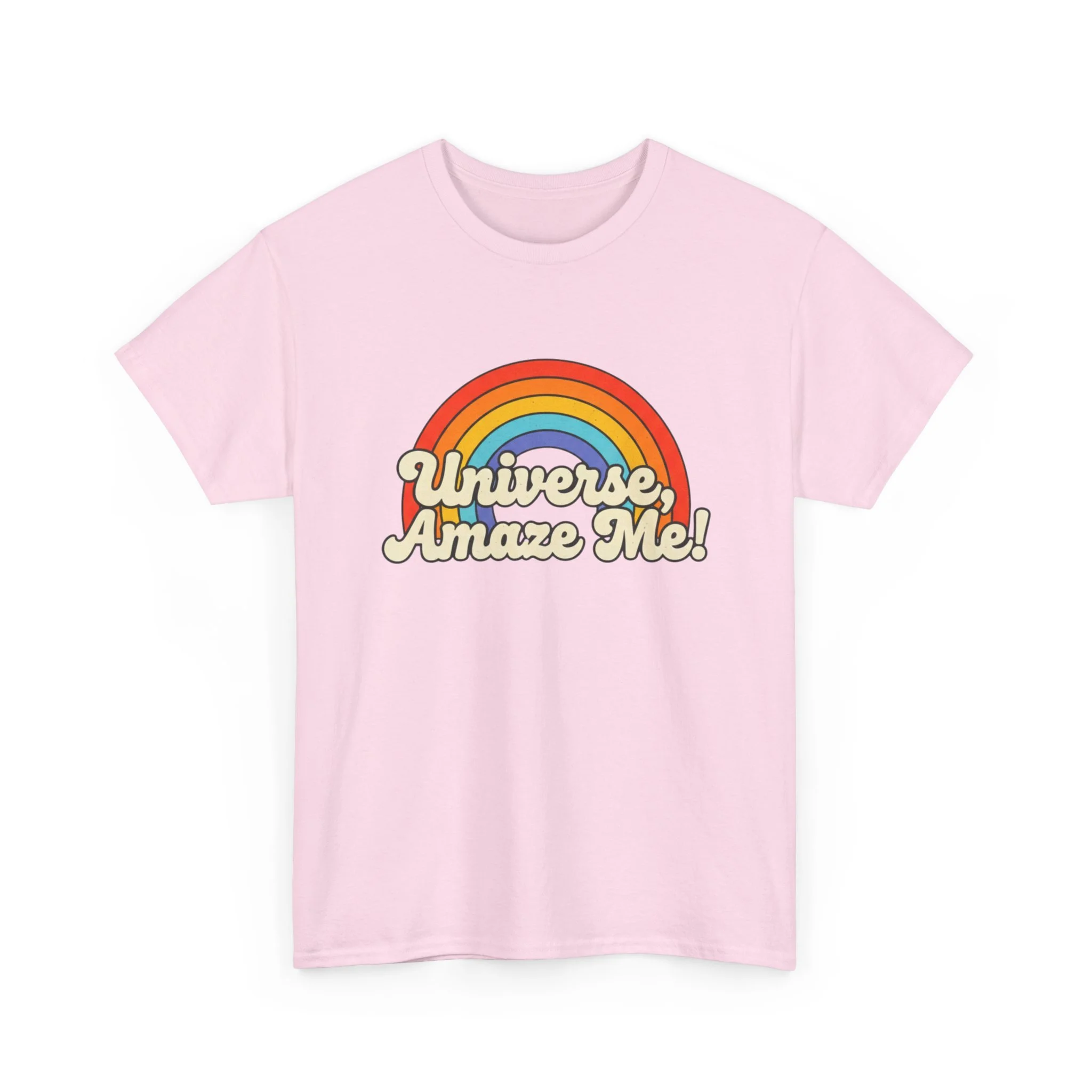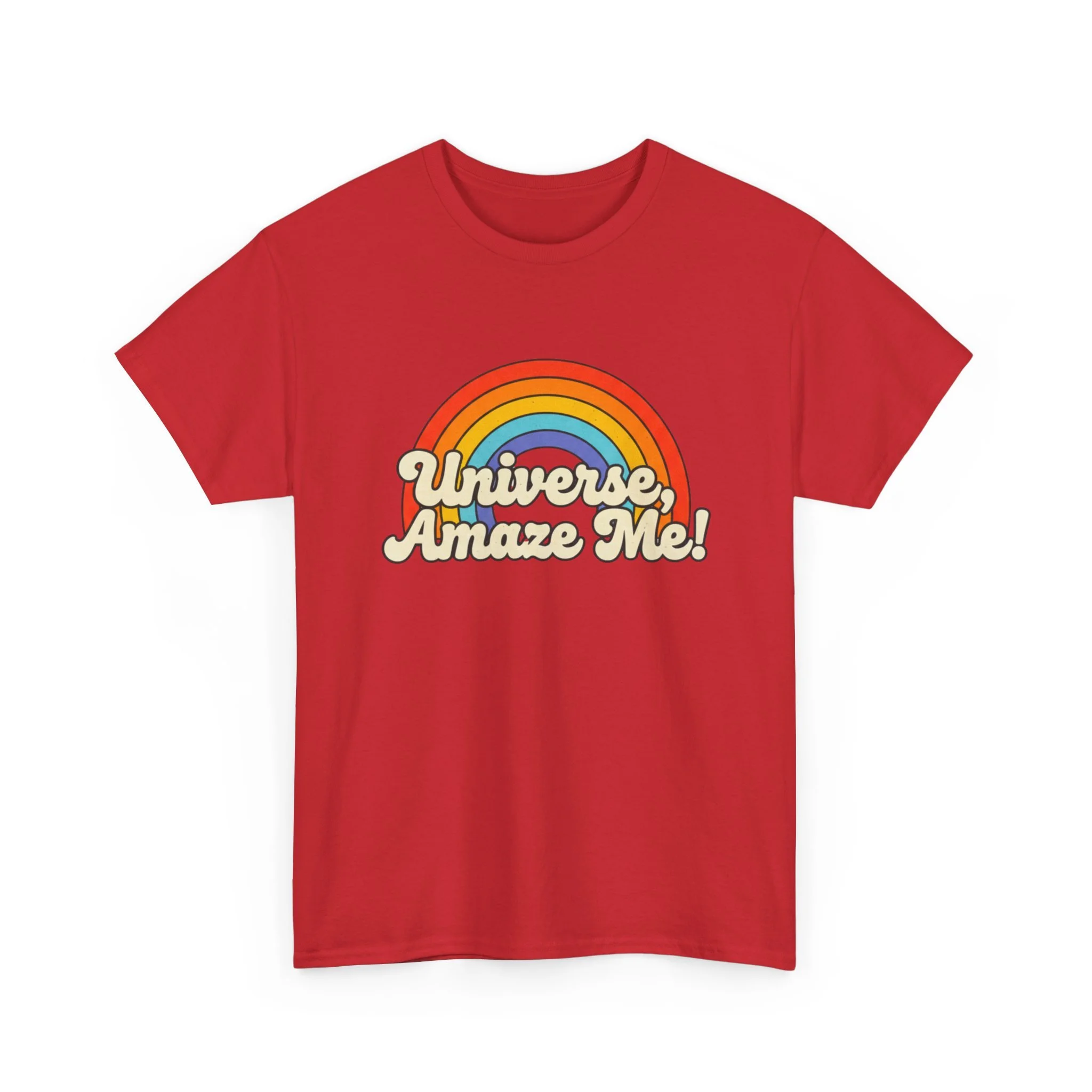 The Universe, Amaze Me tee sends your mantra out to the universe! Soft, nostalgic, and quietly bold — this classic tee carries a warm rainbow and the playful line “Universe, Amaze Me!” across the chest. Wear it when you want a little optimism tucked into your day: morning coffee runs, slow drives with the windows down, or low-key hangouts with friends who get your vintage-loving, wonder-chasing vibe. The design sits centered and approachable, the colors feeling sun-faded rather than shouty — like a retro postcard for hopeful days. It layers easily under a denim jacket or stands alone with rolled sleeves, adding personality without trying too hard. Lightweight but sturdy, it moves with you and keeps its shape through repeat wears and washes.