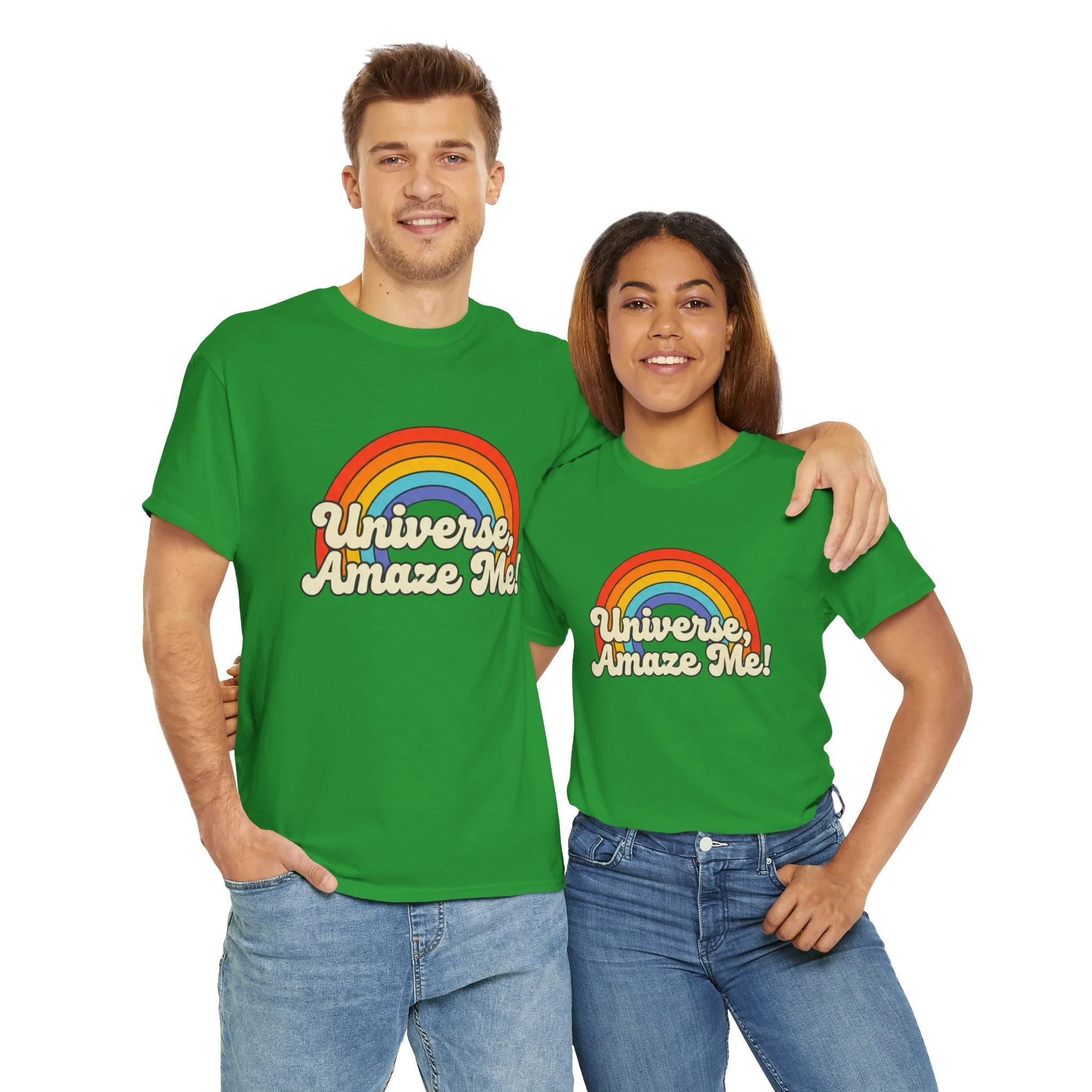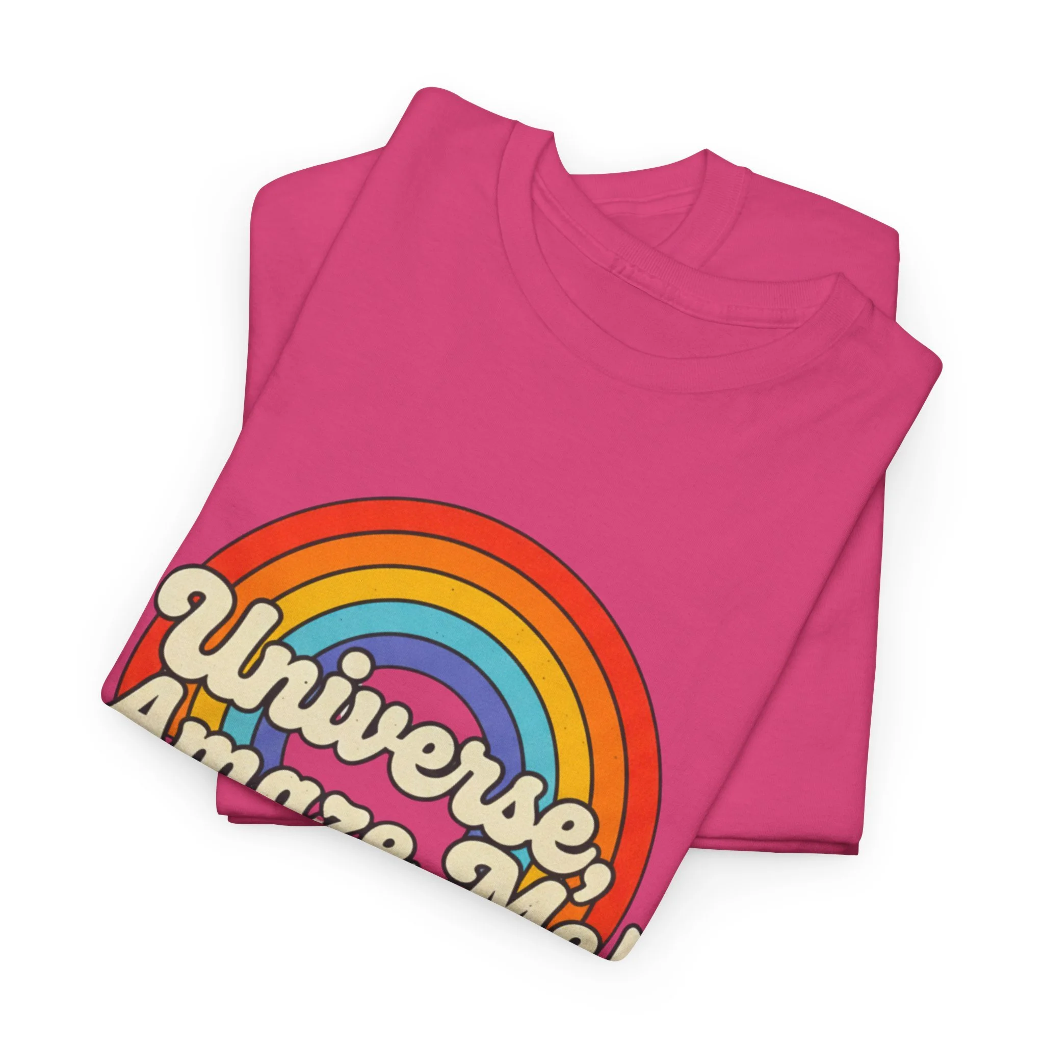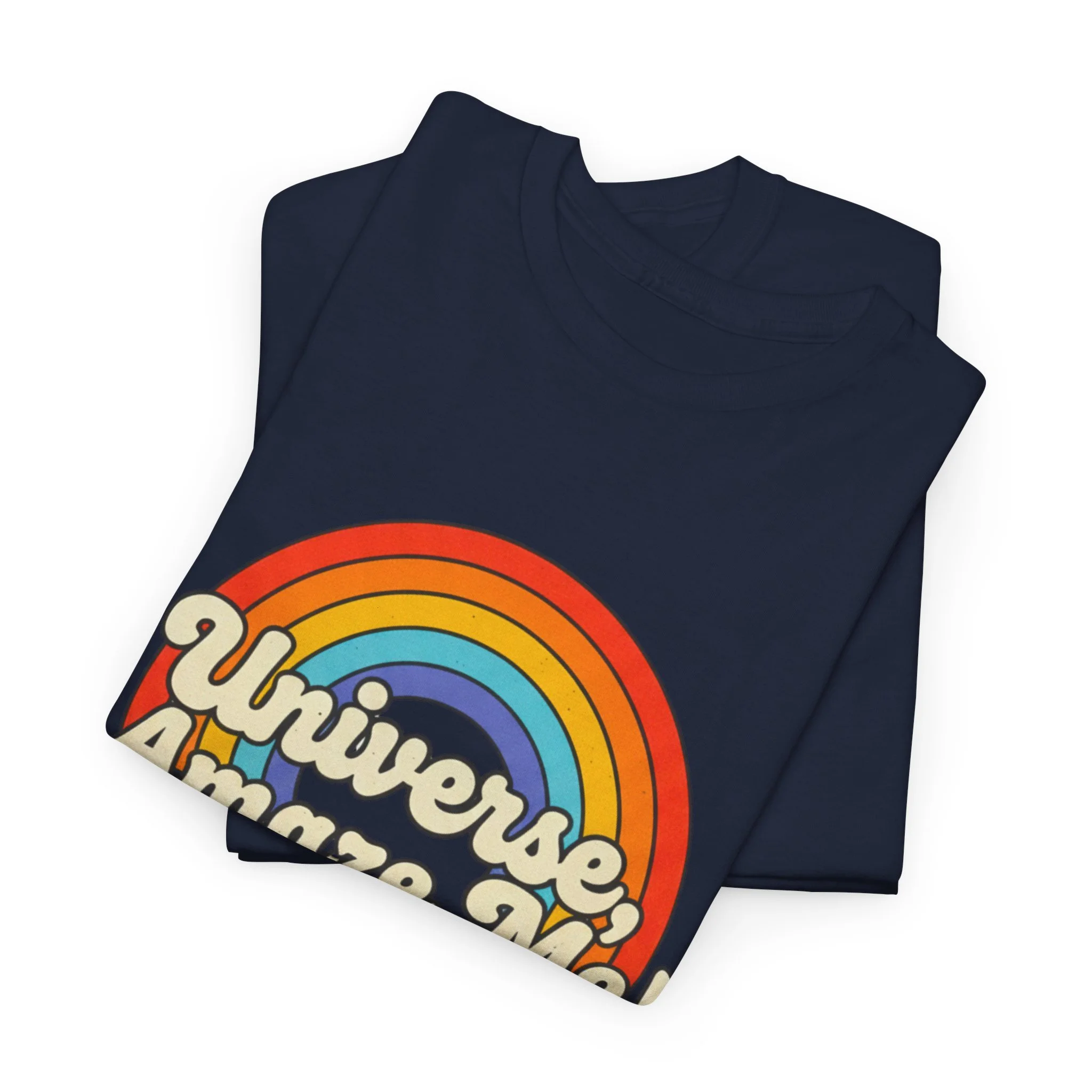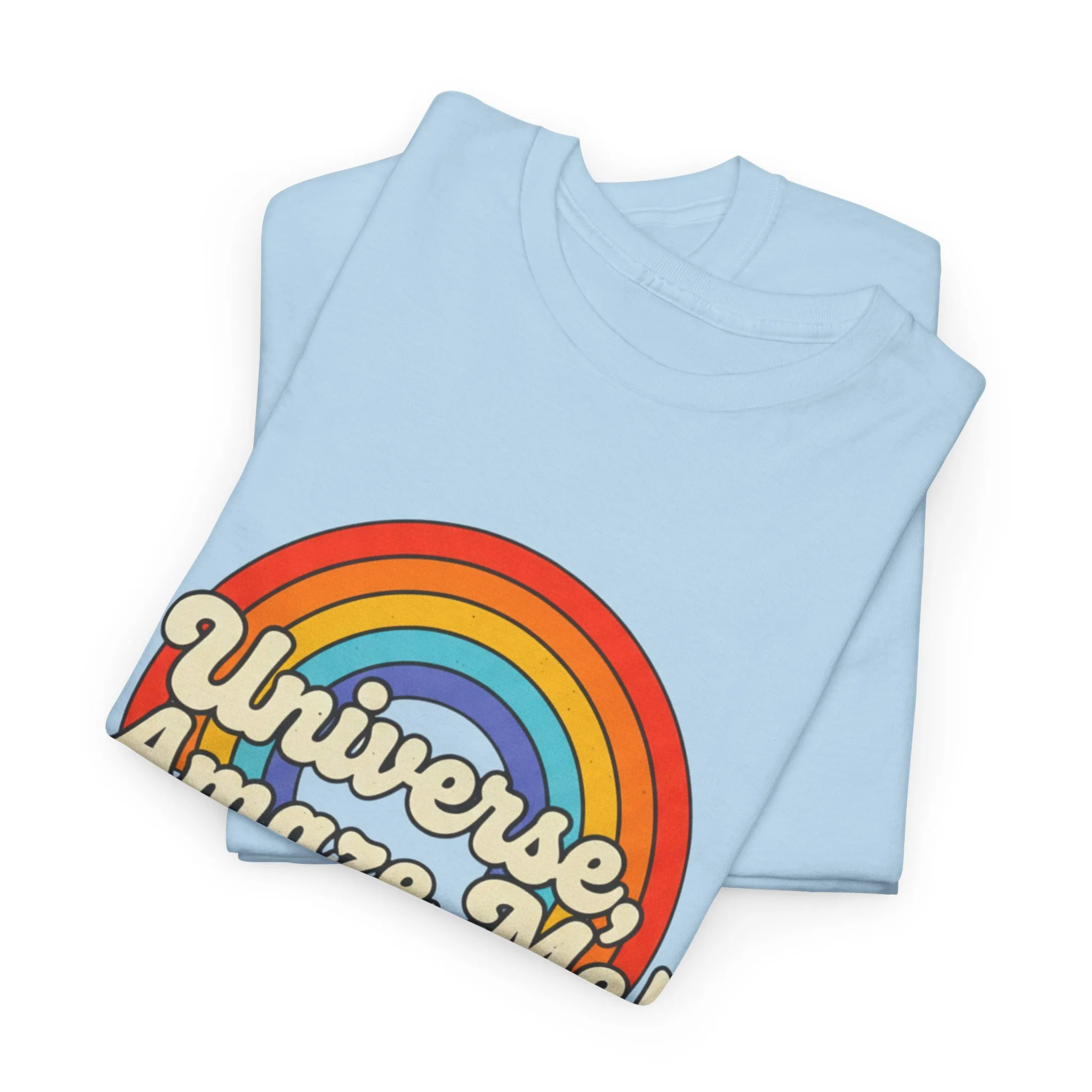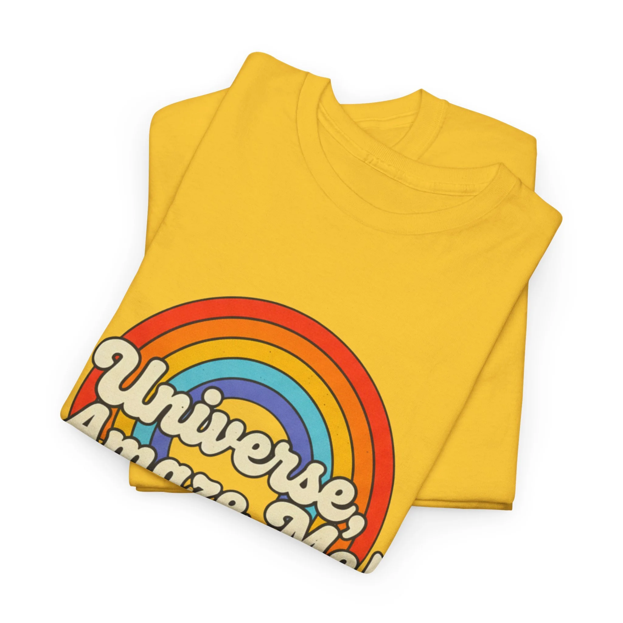 The Universe, Amaze Me tee sends your mantra out to the universe! Soft, nostalgic, and quietly bold — this classic tee carries a warm rainbow and the playful line “Universe, Amaze Me!” across the chest. Wear it when you want a little optimism tucked into your day: morning coffee runs, slow drives with the windows down, or low-key hangouts with friends who get your vintage-loving, wonder-chasing vibe. The design sits centered and approachable, the colors feeling sun-faded rather than shouty — like a retro postcard for hopeful days. It layers easily under a denim jacket or stands alone with rolled sleeves, adding personality without trying too hard. Lightweight but sturdy, it moves with you and keeps its shape through repeat wears and washes.