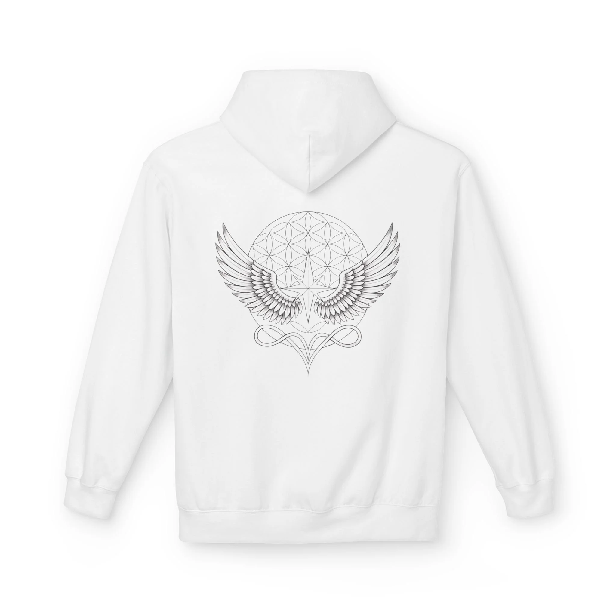 Let your clothes lift your frequency. This "Universe Amaze Me" symbol has been infused with energy to raise your frequency, and protect you. A soft, midweight hoodie that feels like a quiet morning—open, roomy, and reassuring. The back features a finely detailed winged emblem set against a subtle geometric halo, sketched in delicate lines for a restrained, mystical look. Wear it on slow walks, late-night stargazing, or while sketching by the window; the dropped shoulders and pouch pocket keep things relaxed and easily wearable, while the warm jersey-lined hood adds comfort without bulk. Thoughtfully made with OEKO-TEX certification and socially conscious factories, this hoodie blends thoughtful design with mindful production for people who care about craft and conscience.